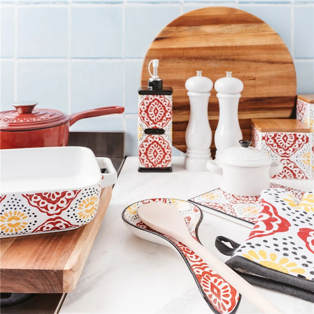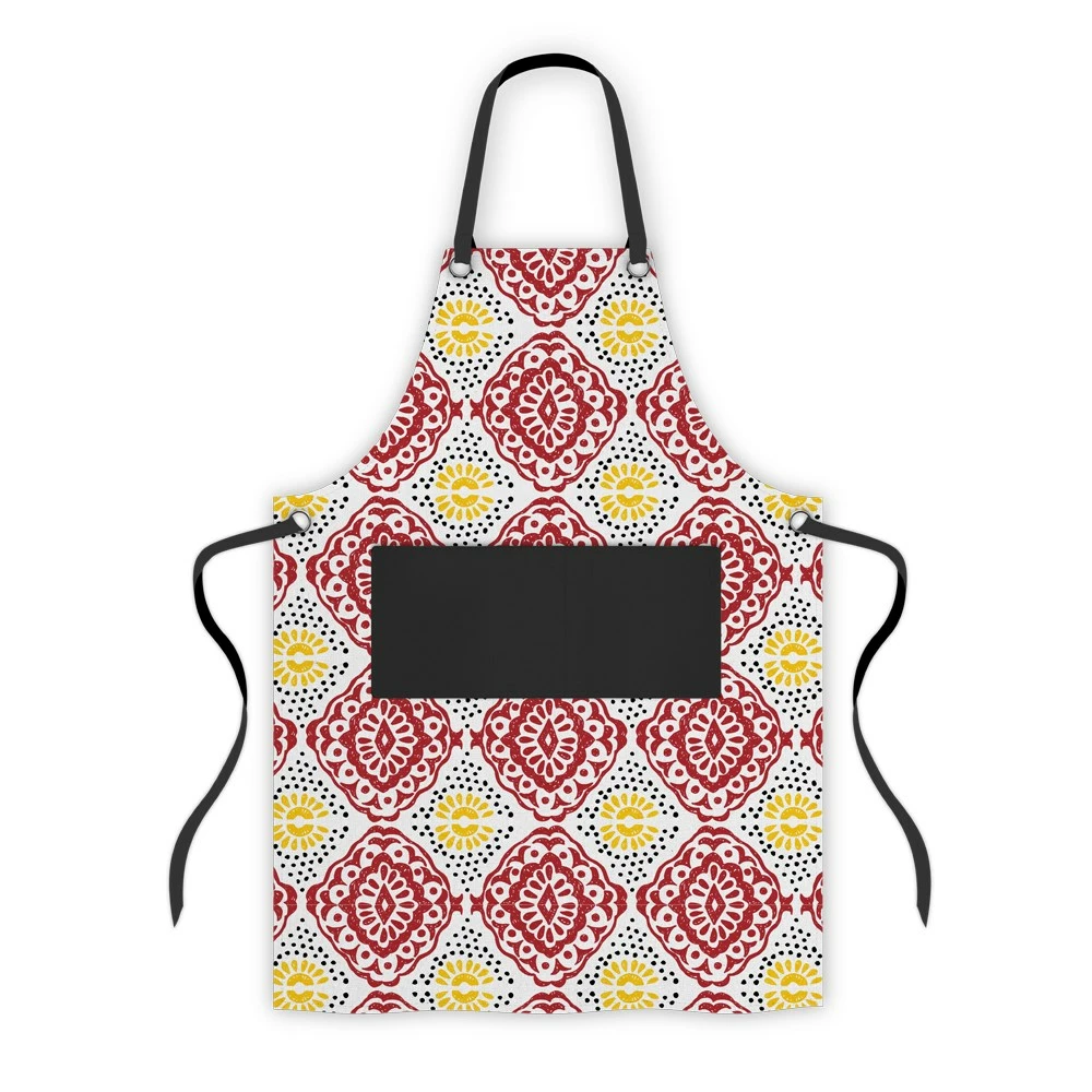 - Features a stylish red, yellow and white patterned design