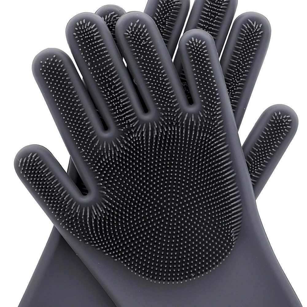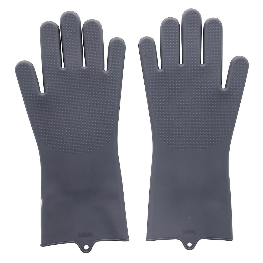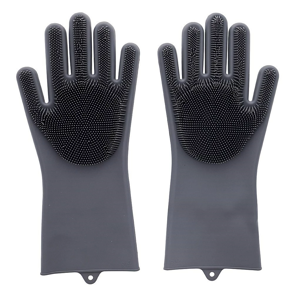 - Both gloves are equipped with silicone cleaning bristles that effectively scrub food and grime from dishes without causing damage