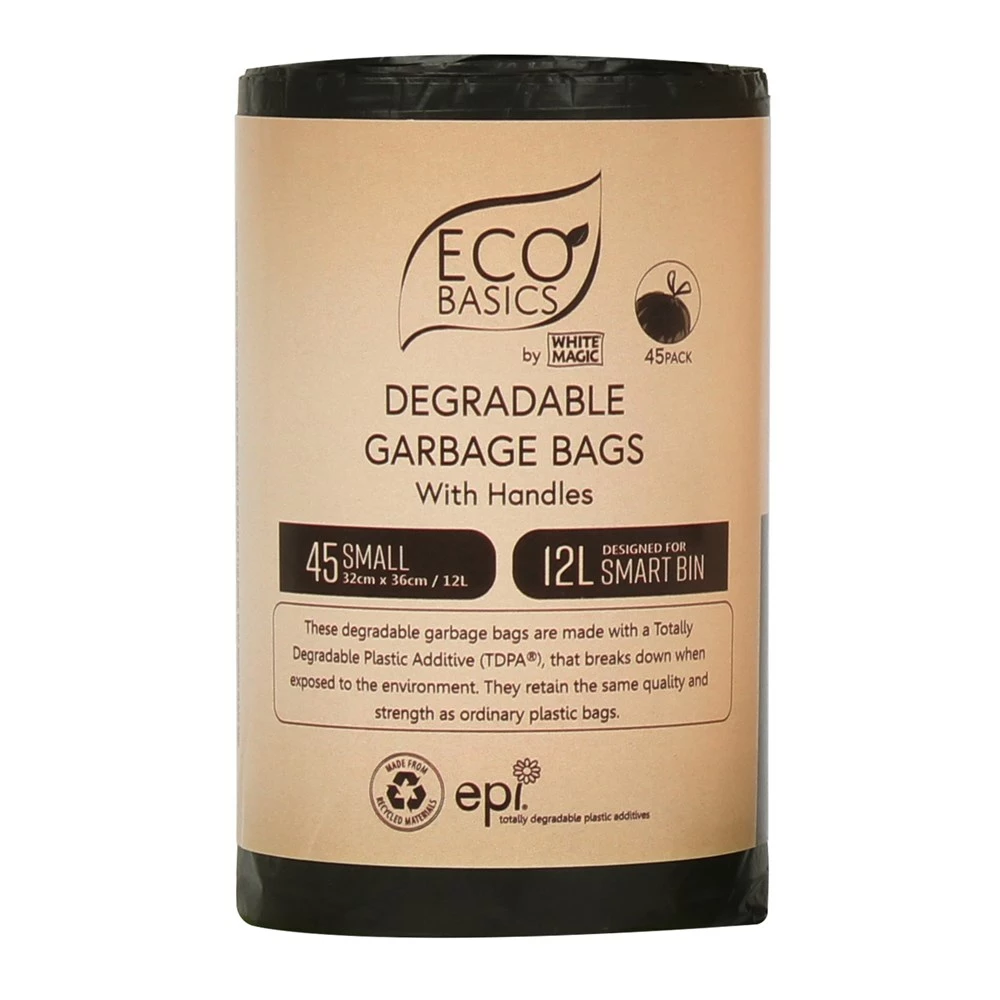 Choose the environmentally friendly plastic free option for your home with the White Magic Eco Basics Garbage Bags Small. Made from the plastic additive TDPA and an EPI additive that supercharges the degradation process the White Magic Eco Basics Garbage Bags Small are fully degradable and breakdown with 2 years of being in the environment. Designed to fit perfectly in your the White Magic Smart Bin 12L, the bags are of the same strong quality as a normal plastic bag and have tough handles making it easy to transport rubbish.